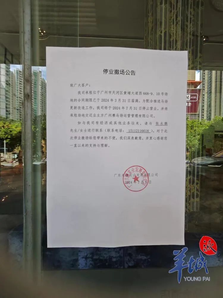 马会酒店外张贴了停业撤场公告主力店的搬离,对马场清场工作至关重要。在马场项目内,马会家居、马会酒店、马场水疗等就属于主力店。而今,除了马会家居要清场,在马会酒店入口的玻璃门上,记者也看到了张贴的停业撤场公告:“天河区黄埔大道西668-9、10号场地的合同期限已于2024年3月31日届满……将于2024年7月31日停止营业,并将场地交还给业主方广州赛马场运营管理有限公司。”
