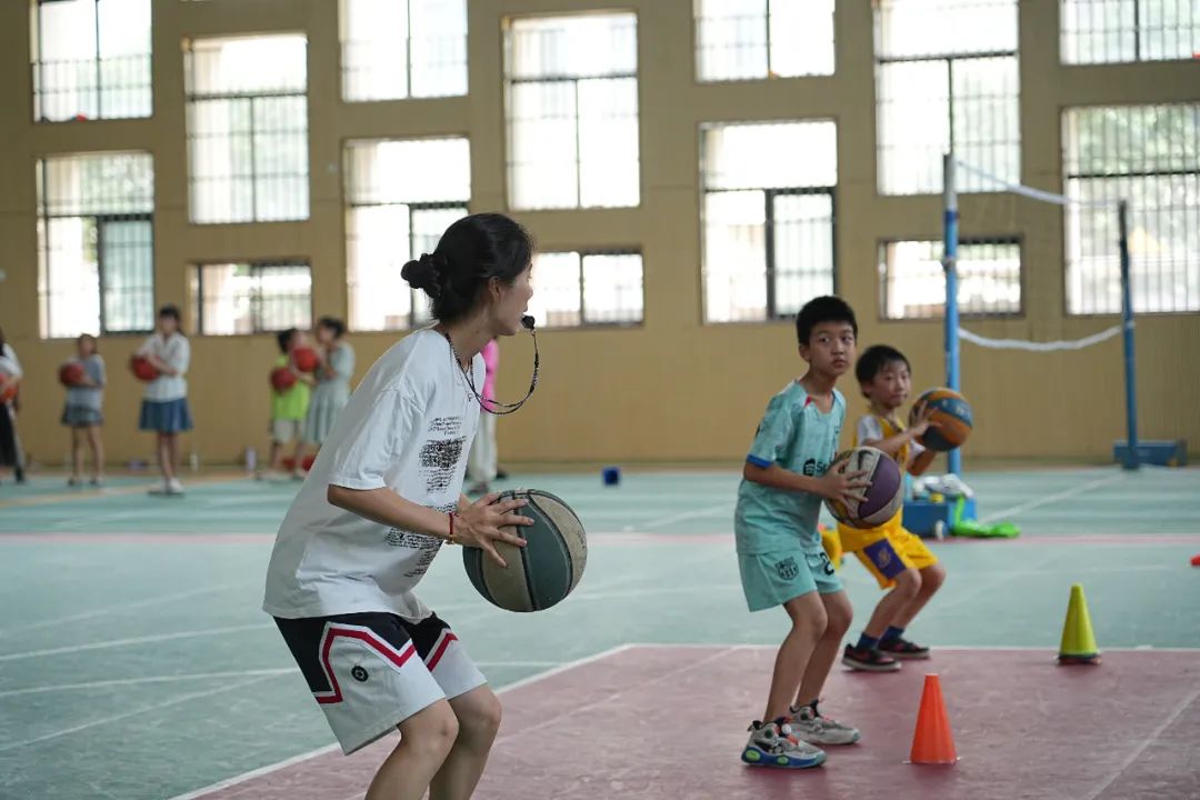 而在另一边的熟溪小学,室内运动场里,数十名孩子们正在老师的带领下练习投篮、运球、上篮等篮球动作,尽情挥洒汗水。为了实现身心两健,公益托管班每天要安排一小时的室外活动时间,让孩子们通过运动,纾解压力,强健体魄。