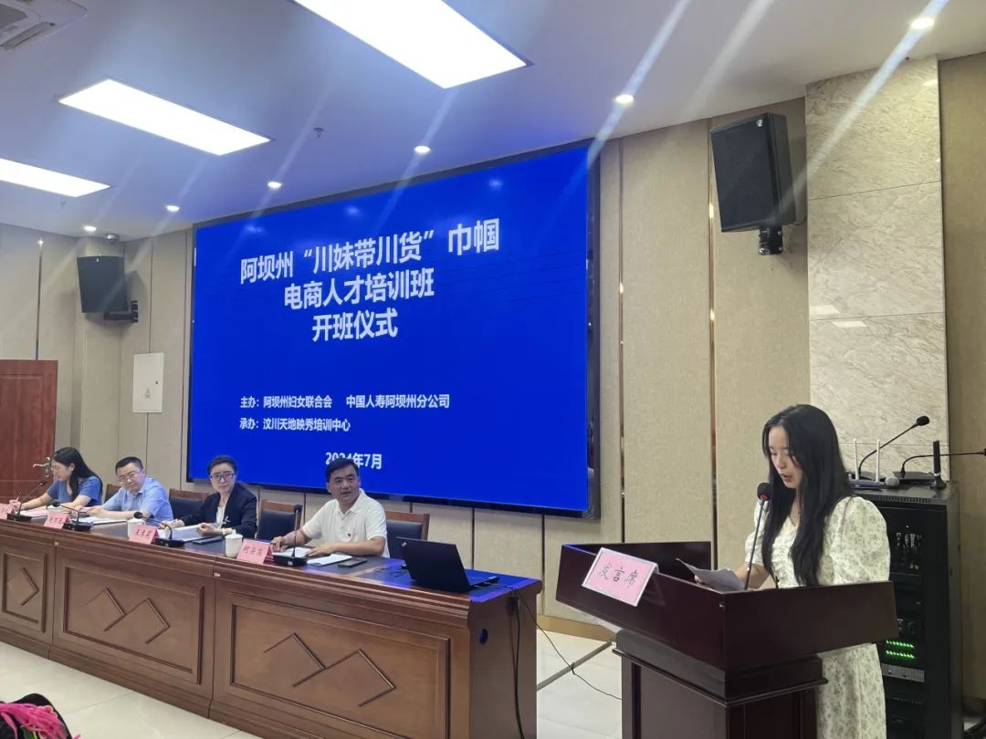 为认真贯彻落实习近平总书记关于妇联及妇女儿童工作的重要论述和习近平总书记关于"三农"及就业创业工作的重要指示精神,全面贯彻落实中央省州各项部署要求,7月8日至12日,由阿坝州妇联、中国人寿阿坝州分公司联合举办的阿坝州“川妹带川货”巾帼电商人才培训班在汶川映秀圆满举办。阿坝州妇联党组成员、副主席王孝莉,中国人寿阿坝州分公司党委委员、总经理助理赵万通参加开班、结业仪式并讲话,汶川天地映秀培训公司总经理何宗发参加开班仪式并致辞,州妇联发展联络部部长高瑞鑫主持开班和结业仪式。