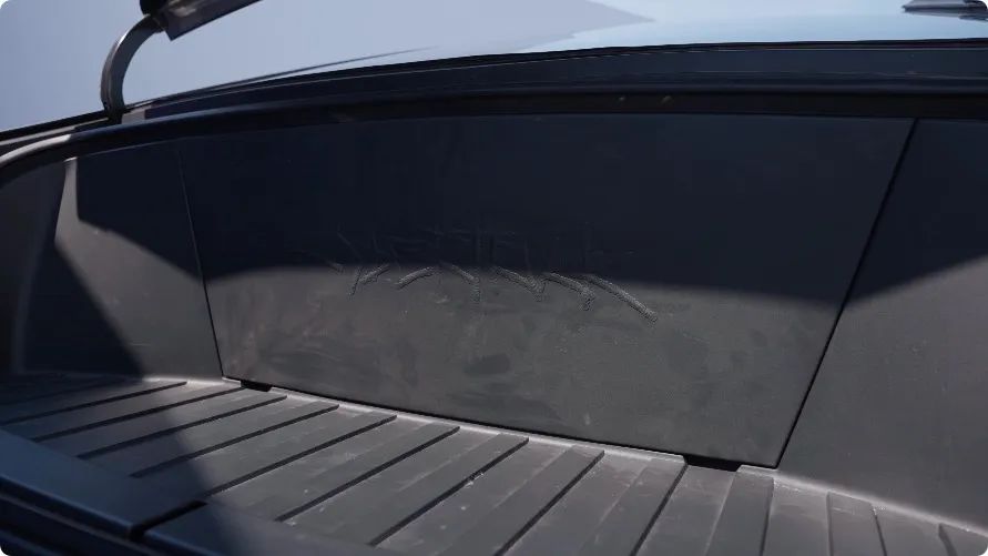 ( 垫板上还印着 cybertruck 车型的 logo ,这个 logo 是无数个小小的焊点模样拼起来,非常非常帅 )而且作为皮卡,这车后边当然还有一个后斗,打开上面的电动卷帘盖,可以看到里边空间嘎嘎大,纵深能达到 1.8 米,横向 1.2 米,完全可以放张单人床进去,玩累了,就直接睡觉。