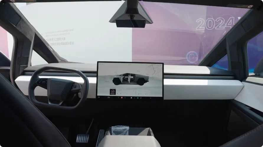 ( 不愧是 30X 不锈钢外壳,开门是真的沉 )作为一辆特斯拉,咱们就别想着内饰有多少 “ 冗余配置 ” 了, Cybertruck 还是一脉相承的简约,仪表台除了一条横贯左右的金属,基本没有别的装饰。