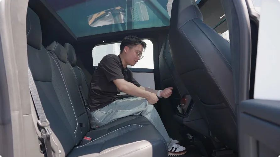 然后咱们再坐到后排看看。因为车身尺寸大,车内空间是完全足够的,像脖子哥这样准 1 米 8 的身高,在车内后排完全不顶头,腿部也有两三拳的距离。