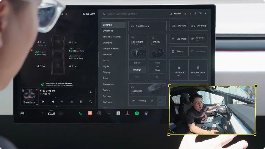 好了,接下来直接试车,虽然这车很大也很重,整备质量有 3 吨,但我开起来,感觉就像一台 1 吨的 MINI 一样灵活,这点我真没有夸张。比如在这个 90 度的直角弯,一般的车咱们得打一圈多的方向才能过,但 Cybertruck 只需要打 120 度左右,而且手感一点也不重,感觉很灵巧、轻盈,不像是一台比 MEGA 还大的车。