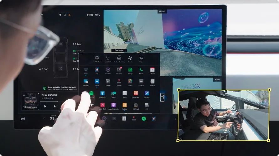 所有功能它都是全盘托出,不需要再多打开什么菜单,比如这里的悬架调节、后斗开关,都是在一个框里直接调节,用起来就是很简单、很舒服。另外比较有意思的是,底部按钮还可以打开一个快捷键的设置中心,有电话、地图、蓝牙、听歌、游戏、车辆信息等等。