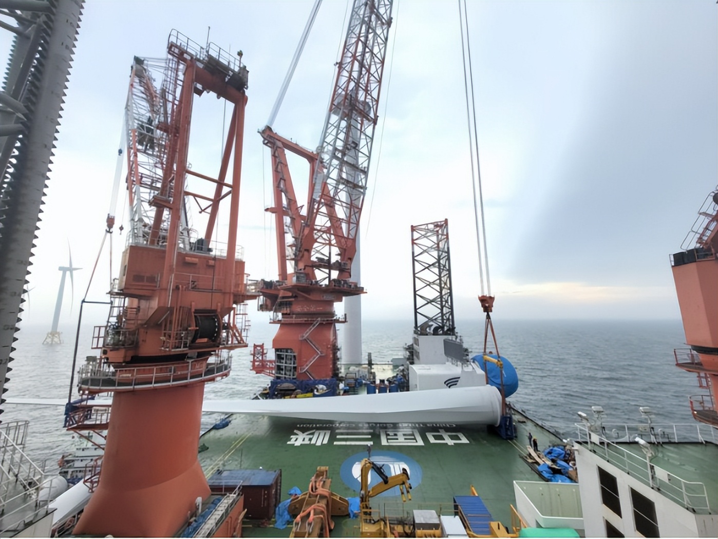 ▲ “白鹤滩”号正在漳浦二期项目吊装16兆瓦海上风电机组