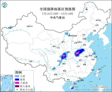 预计,7月14日14时至15日14时,陕西南部、四川东部和南部、湖北北部、河南中南部、安徽北部、江苏南部及海南岛东南部、内蒙古河套地区等地部分地区有大到暴雨,其中,四川东北部、河南南部、湖北北部等地部分地区有大暴雨,局地特大暴雨(250~270毫米)。上述部分地区伴有短时强降水(最大小时降雨量30~50毫米,局地可超过80毫米),局地有雷暴大风等强对流天气。