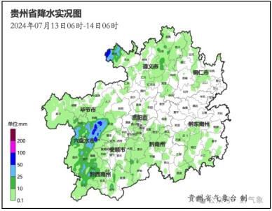 昨日贵州西部局地出现大到暴雨 两站大暴雨7月13日06时至14日06时,六盘水市六枝特区的牛坡村和中寨捞河小学分别出现129.7毫米和100.4毫米的大暴雨,暴雨出现在六盘水市的六枝、水城,毕节市的纳雍、织金,遵义市的赤水,黔西南州的晴隆6县(市、区)域内的18个观测站,大雨有101个观测站,中雨有223个观测站。中雨以上降雨主要在遵义市西北部、六盘水市中北部、毕节市南部、黔西南州中部。10个县(市、区)出现48站次短时强降水,小时雨强最大为六枝堕却61.7 毫米(13日17时至 18时)。