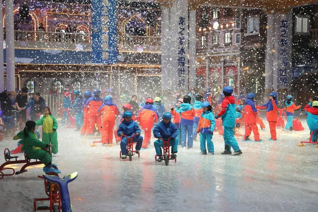 欢乐小火车、冰上旋转木马、冰上碰碰车等娱乐设施深受小朋友的喜爱。冰湖游乐场定时开展《冰雪精灵》《童话小丑》等原创冰湖剧目。雪场内的滑雪道上,欢笑声和惊呼声此起彼伏……