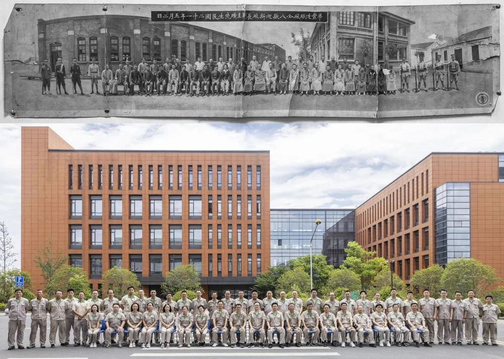 上图:杭州老华丰, 1932年,建厂十周年之际,迎接新厂长刘圭瓒赴任时的合影。下图:安吉新华丰,2022年,建厂100周年之际,干部职工合影。2014年,建厂已有92年历史的杭州华丰造纸厂,迁址至与杭州毗邻的湖州安吉县天子湖工业园区,于2017年正式投产。曾经的重污染企业——华丰造纸厂——也在绿水青山间实现了华丽转身,重新焕发了生机。