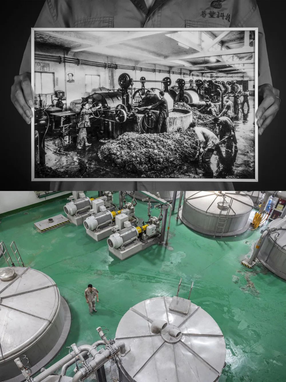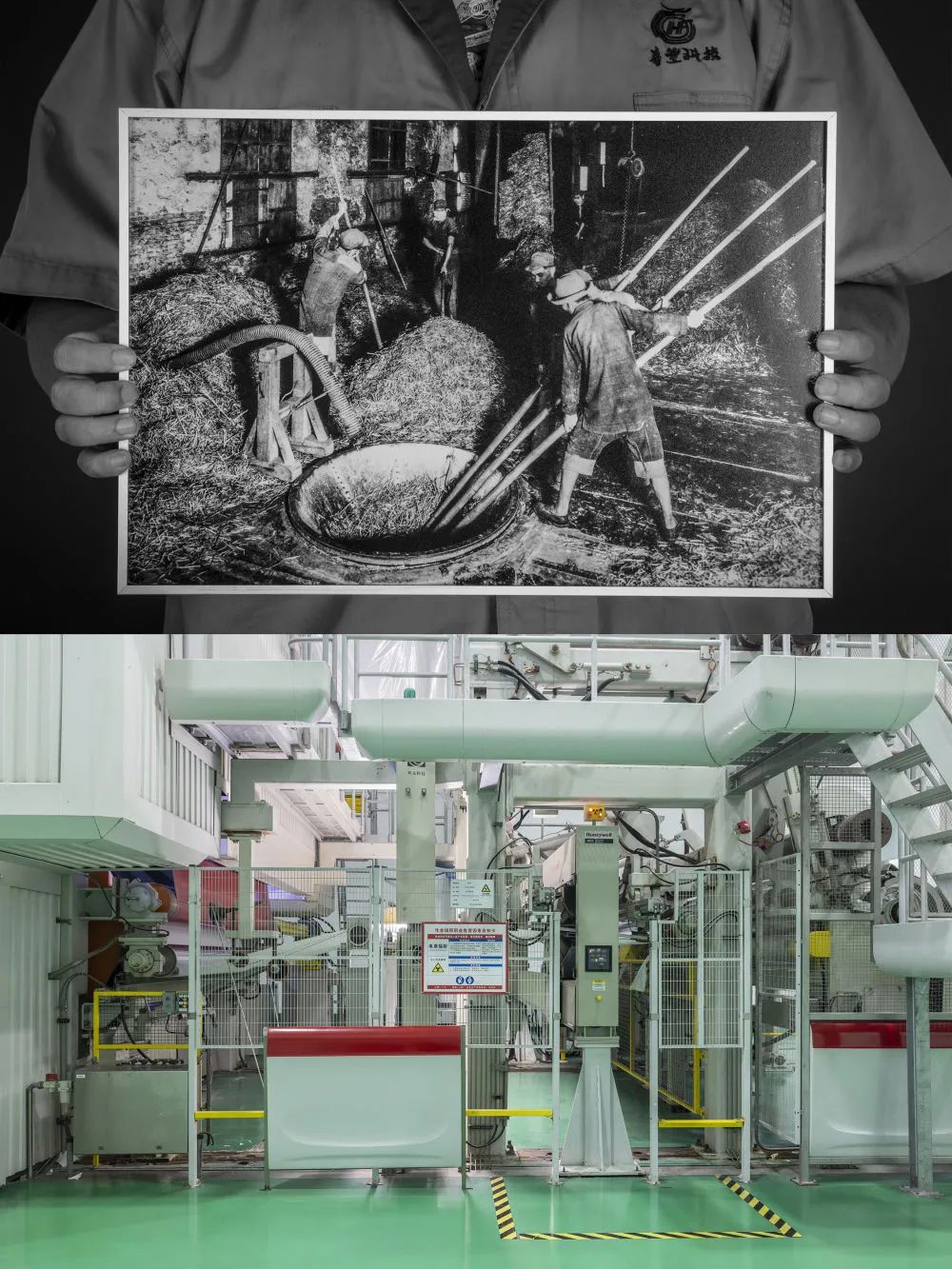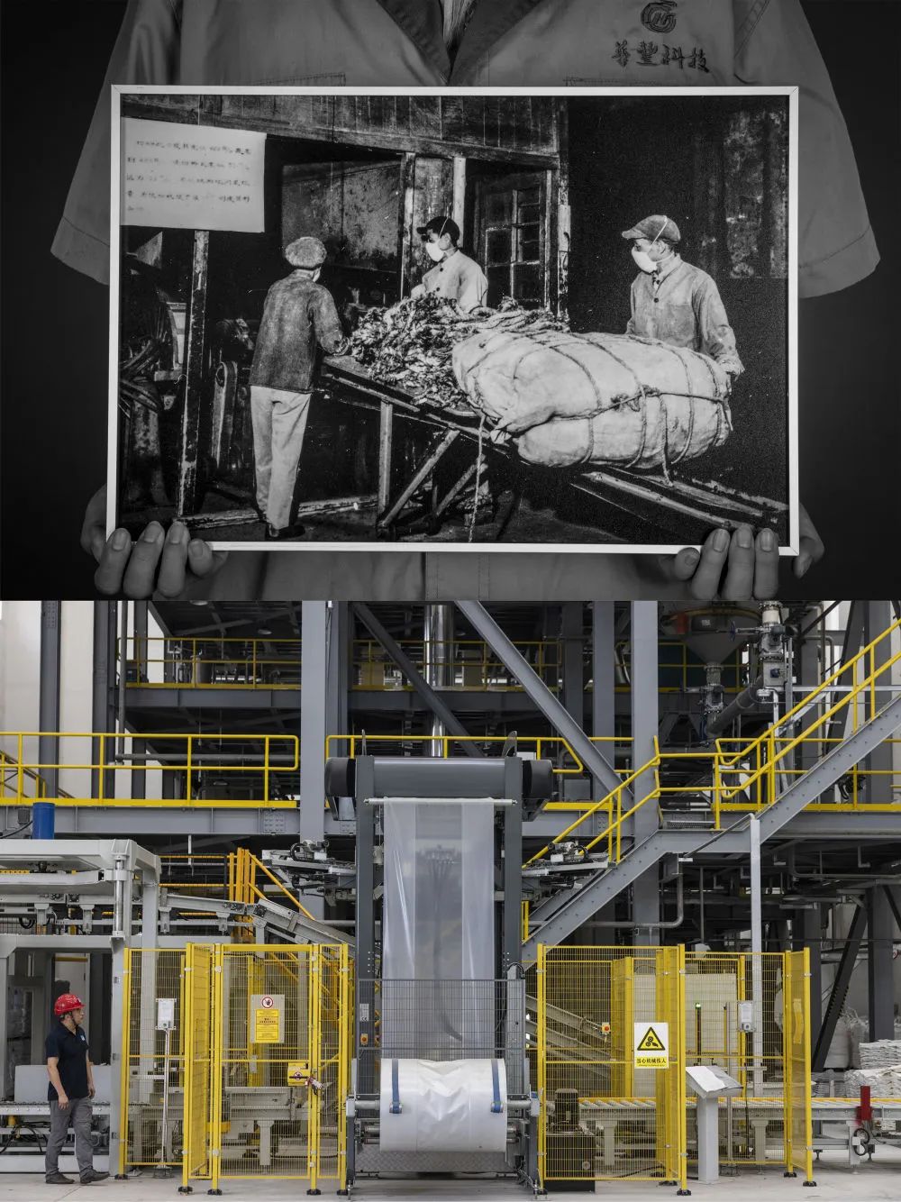 上图:1980年代,杭州老华丰的切草车间。下图:2022年,安吉新华丰引入智能化流程。