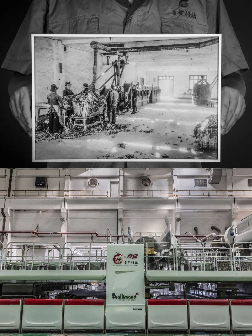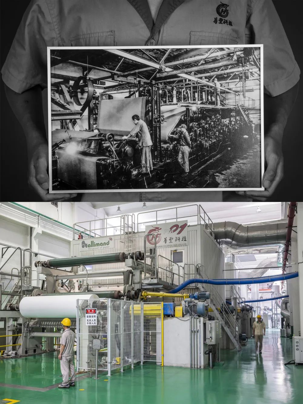 上图:1980年代,杭州老华丰的蒸球车间,蒸球是制浆的重要工具,当时机械化程度很低,生产主要靠人力。下图:2022年,安吉新华丰的生产设备全部实现自动化、智能化。