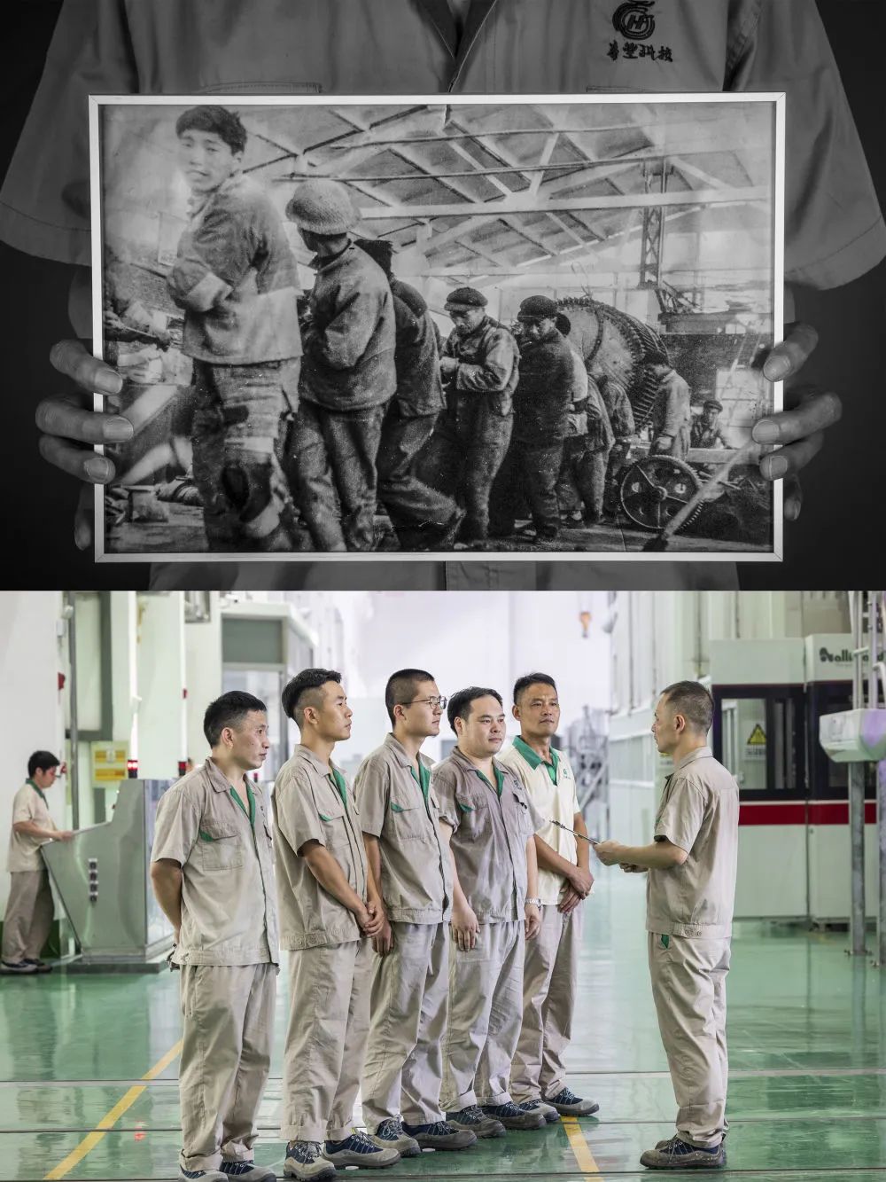 上图:1980年代,杭州老华丰的车间工人。下图:2022年,安吉新华丰生产车间,工人正在进行每日班前例会。