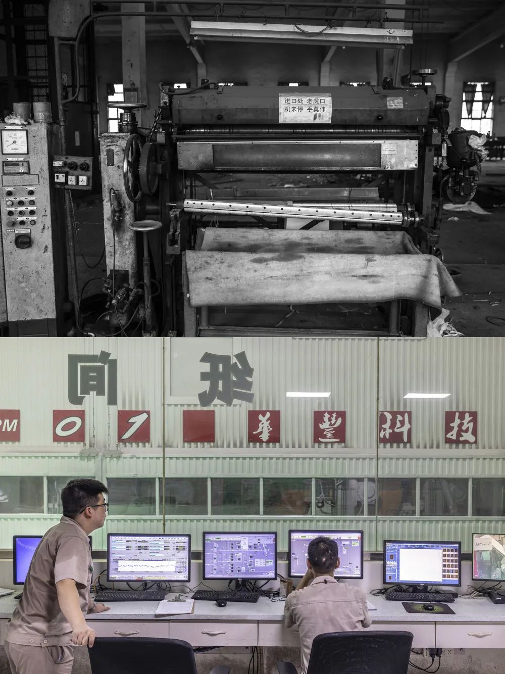 上图:1980年代,杭州老华丰的这台设备上赫然写着“进口处,老虎口,机未停,手莫伸”12个大字。1980年代,机器设备伤人的事故时有发生。下图:2022年,安吉新华丰,所有设备的操作全在独立的控制室里进行,人机分离,安全有保障。