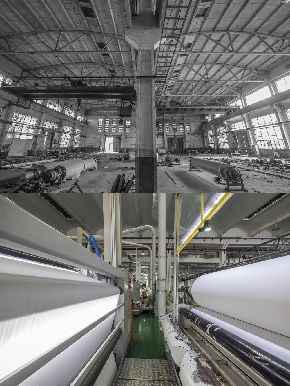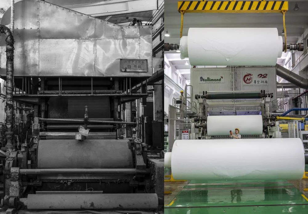 左图:杭州老华丰的4号造纸机,启用于1992年,到2017年停产时已经陈旧落后,被淘汰。右图:安吉新华丰,新厂房、新设备,旧貌换新颜。