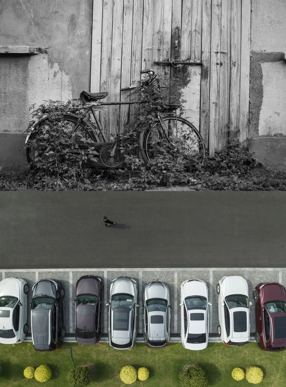 上图:1990年代,杭州老华丰,工人骑自行车上下班。下图:2022年,安吉新华丰,工人上下班几乎人人都开车。