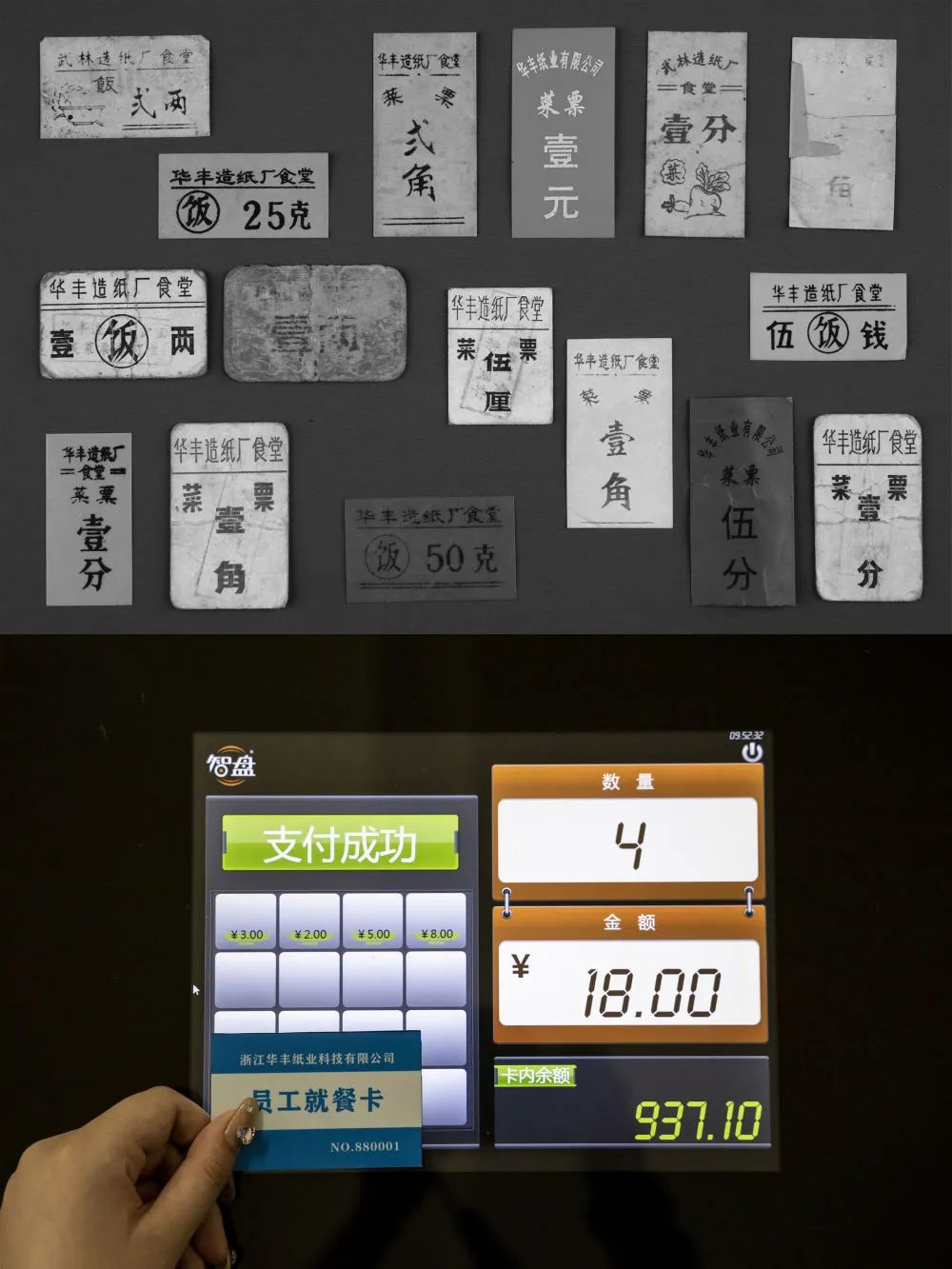 上图:1980年代,杭州老华丰,食堂凭饭菜票吃饭。下图:2022年,安吉新华丰,食堂用的是智盘刷卡。