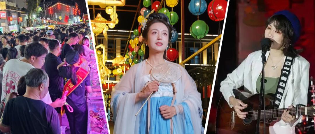 夜幕下的九龙汇夜肆灯光璀璨、热闹非凡。从上空俯视如同一片璀璨星海。这里有古色古香的摊位,琳琅满目的手工艺品,还有身着汉服的游客穿梭其中。舞台上正在表演着精彩的国风节目,一夕间仿佛时空错位,带领观众穿越回到了千年以前的秦汉雅集。