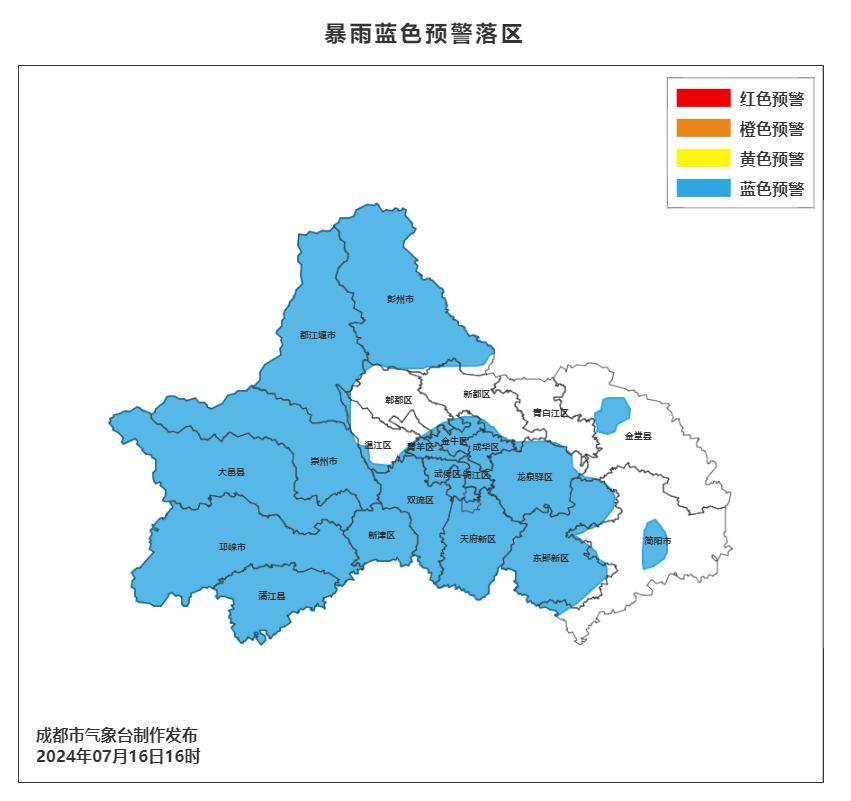成都市气象台2024年7月16日16时20分发布暴雨蓝色预警:预计今天晚上到明天白天我市大部分地方有强降雨,其中彭州、都江堰、崇州、大邑、邛崃、蒲江、新津、双流、龙泉驿、天府新区、东部新区和主城区的部分地方有暴雨(雨量50~80毫米),个别地方大暴雨(雨量100~150毫米),最大小时雨量40~60毫米。过程期间,可能伴有短时强降雨、雷电和阵性大风等强对流天气。请注意防范暴雨、雷电和阵性大风带来的不利影响。