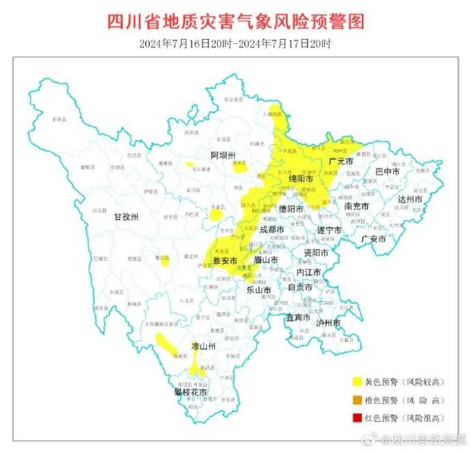 根据四川省气象台天气预报情况,结合四川省地质环境条件,7月16日20时至7月17日20时,全省地质灾害气象风险预警结果如下: