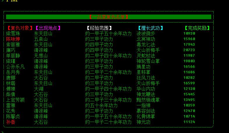 以上提到的这些东西,你可以运用在你身边的一切活物身上。从村口的鸡野外的蛇,到游戏里每位 NPC ,你都可以输入 hit ,和对方酣战三百回合。你也可以选择输入击杀指令 kill ,和对方不死不休,但你也要承担后果,要么贿赂要么跑路要么等死。