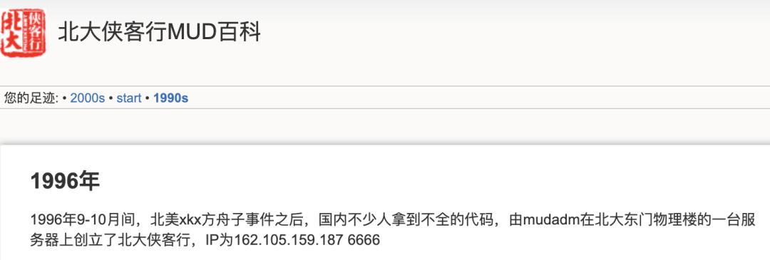没错,和很多家长 “ 不学好玩游戏 ” 的想法截然相反,《 北大侠客行 》最初的玩家很多都是清北中科院的高材生以及国外的中国留学生。参与建设游戏的也有很多清北的大佬,像是《 北大侠客行 》在任时间最长的管理者 icer ,就是北大 1994 年计算机系的学生。当时担任管理者的 xuan 也是北大人,他是《 北大侠客行 》初任管理 mudadm 的学弟。