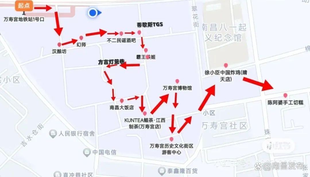 进入大士院美食街后,顺着十字中心街方向往前直走,依次抵达新嘉宾馆和爱心打卡墙。另外,十字中心街向左走,可抵达南昌花墙和南昌灰瓦大字。