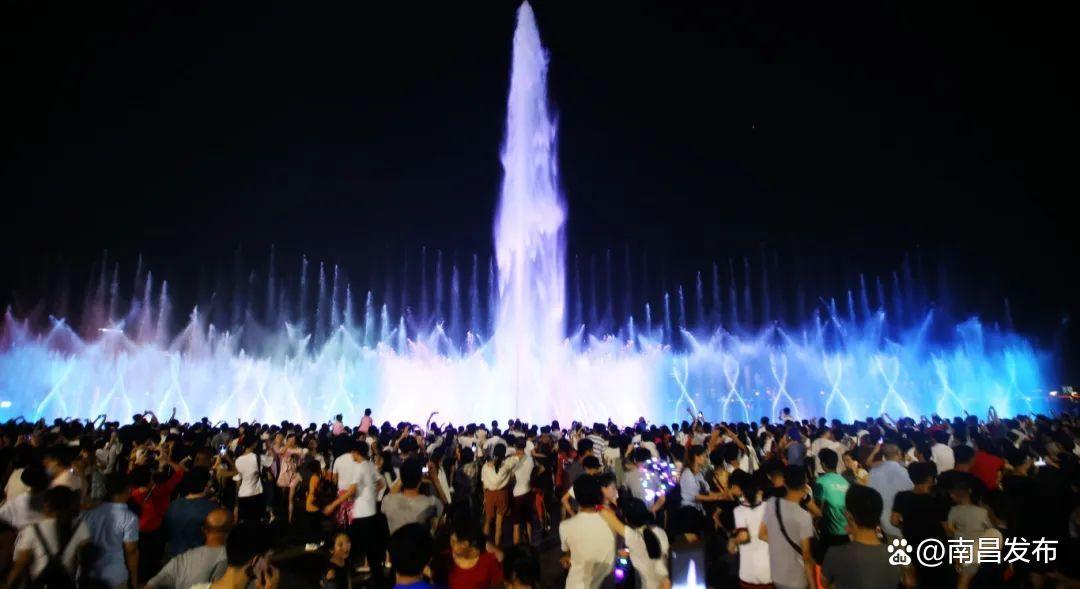 南昌市秋水广场广场总体平面为月牙形,依江而立,与名振天下的滕王阁隔江相望,依《滕王阁序》中名句“落霞与孤鹜齐飞,秋水共长天一色”而命名,拥有全亚洲最高最大的音乐喷泉群。音乐喷泉位于秋水广场的中心地带,共配置了包括中心主喷、环形高喷、圆形摇摆喷泉和数控跑泉在内的共22个水景,水景长达800米。