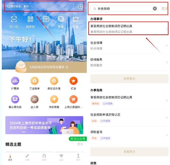 打开“随申办市民云”(APP、微信小程序、支付宝小程序),首页搜索关键词“社会救助”,选择“享受民政社会救助项目证明出具”。