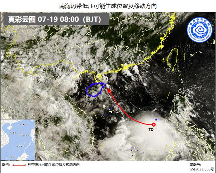南海热带低压可能生成位置及移动方向示意图(底图为风云四号卫星云图)陆地方面