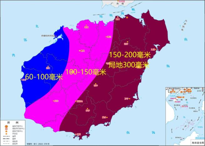 海南省气象台预计,21日08时~24日08时各地累积雨量:海口、文昌、琼海、定安、屯昌、陵水、万宁、琼中、保亭和三亚等市县150~200毫米、局地300毫米,澄迈、临高、儋州、白沙、五指山和乐东等市县100~150毫米,其余地区60~100毫米。