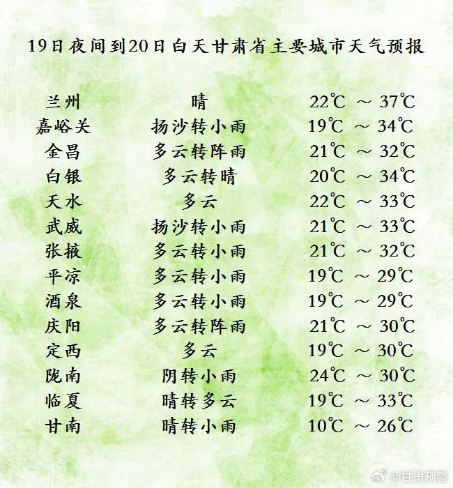 今天夜间到明天白天(07月19日20时-07月20日20时),陇南市阴有小到中雨,其中陇南市东南部有大雨;甘南、定西、天水、平凉、庆阳等州市多云,部分地方阴有小雨或阵雨;河西五市多云转阴,局部地方有小雨或阵雨;省内其余地方多云转阴。另外,河西五市有5-6级西北风,部分地方伴有沙尘。白银北部、兰州城区、临夏北部仍有35℃以上高温。