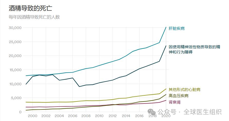 从数据看:与酒精相关的健康问题正在迅速增加,如癌症、肝病、心脏病等(参见下图)