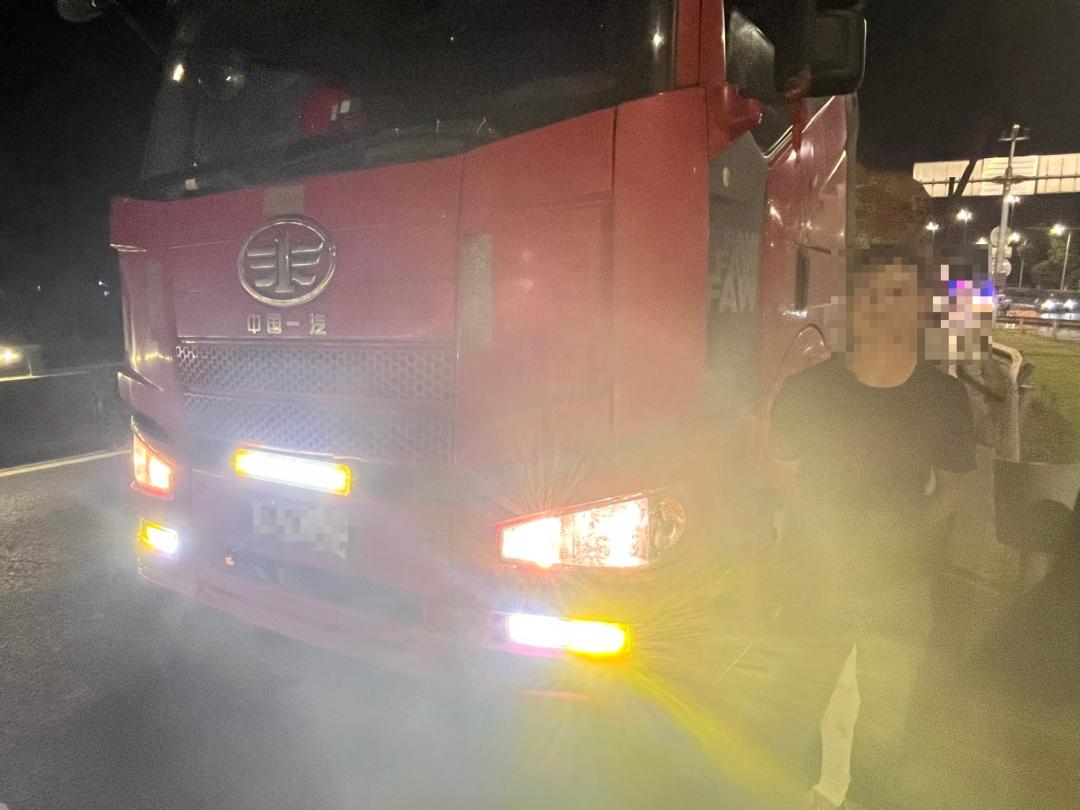 2024年7月2日3时43分,内环快速路交警大队民警在友新快速路石湖路段,查获车牌号苏CSXXXX重型半挂牵引车在前面号牌上方加装“牛眼灯”,利用灯光遮挡住号牌,意图逃避电子警察抓拍其闯禁区的违法行为,民警对驾驶人实施“驾驶故意遮挡机动车号牌的机动车上道路行驶”的违法行为,依法处以罚款200元、记9分的处罚,并责令其恢复原状。03