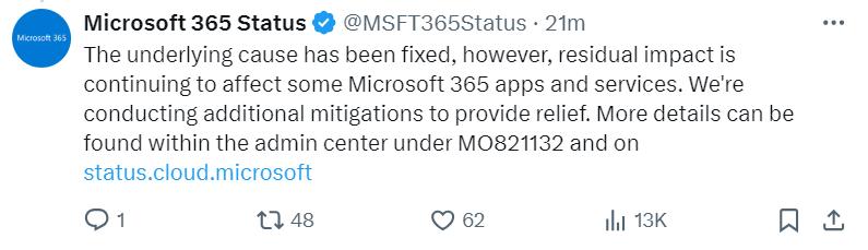此次宕机波及了微软365的多项服务,包括Teams等关键应用。