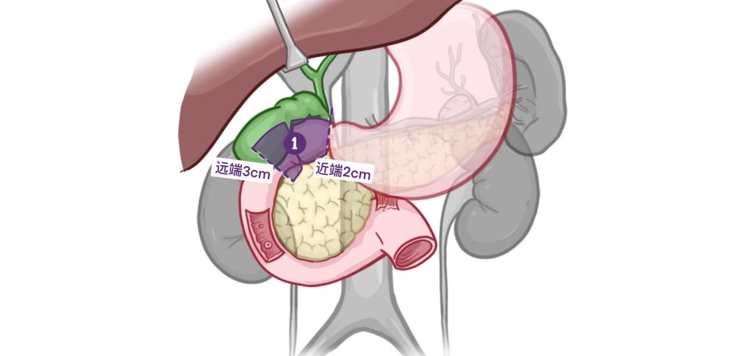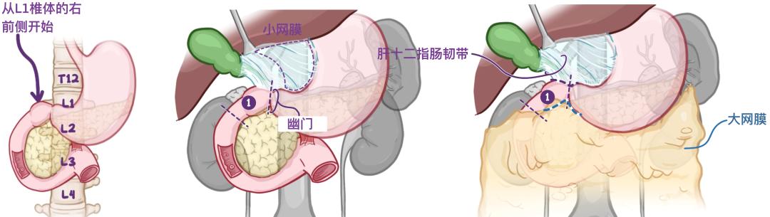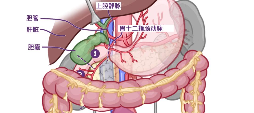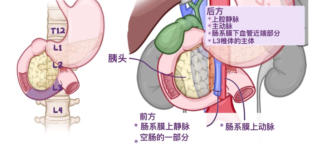 十二指肠的第一段向右侧移动,其上覆盖着肝脏和胆囊,其后有腹膜外动静脉,胆管和胃十二指肠动脉。第二段,即十二指肠的降段,属于腹膜后。它围绕着胰头向下弯曲,与胰头内侧平行,从L1到L3椎体,到上腔静脉的右侧并继续向下。