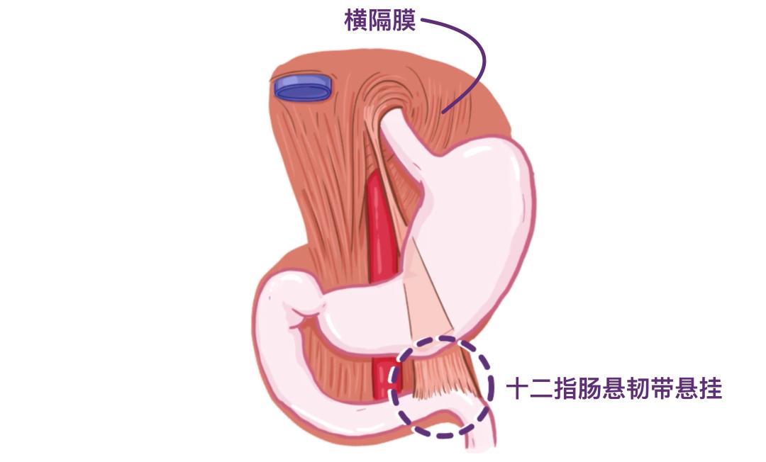 这个位置由十二指肠悬韧带悬挂,也称为特雷兹韧带,由膈肌的骨骼肌和十二指肠的平滑肌组成。