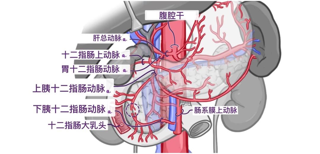 现在我们来谈谈血液供应,十二指肠的主要供血来自腹腔干和肠系膜上动脉。腹腔干供血给肝总动脉,腹腔干还供应十二指肠的第一段和第二段的上十二指肠动脉和胃十二指肠动脉,腹腔干的一个被称为上胰十二指肠动脉的分支,供应十二指肠的前两段至十二指肠乳头处结束。另外,肠系膜上动脉发出一条称为下胰十二指肠动脉的分支,它供应十二指肠乳头之后的其他两段。