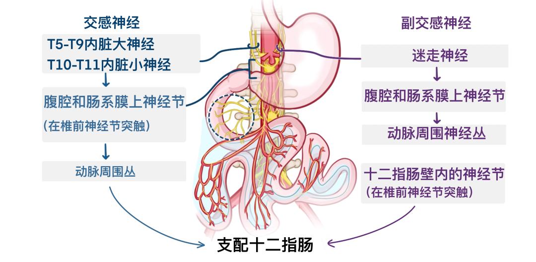 另一方面,副交感神经纤维仅穿过腹腔和上肠系膜神经丛,并最终在十二指肠壁的固有神经节中突触,这两个神经通路最终都将它们的突触后纤维支配十二指肠。