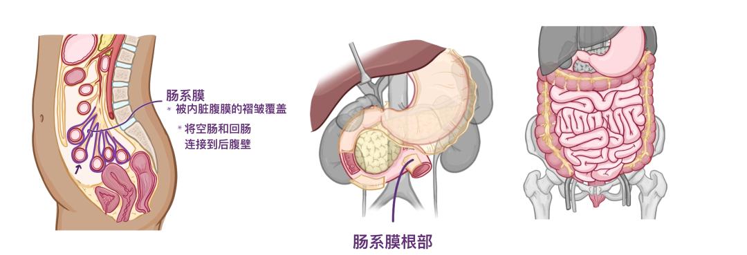 系膜的根部从L2椎体的左侧的十二指肠空肠弯开始,横跨十二指肠的升部和降部、主动脉和下腔静脉,一直到回盲结合处和右骶髂关节。在系膜的褶皱之间,有肠系膜上血管、淋巴管和支配小肠的神经,以及脂肪组织。