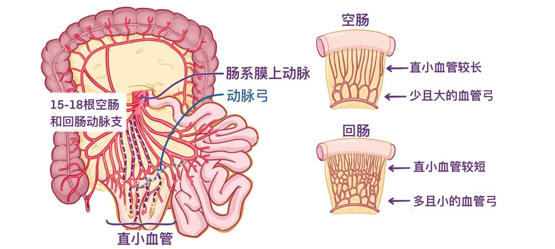 空肠和回肠的动脉血供由肠系膜上动脉提供,它在系膜内行进,分出大约15-18根空肠和回肠动脉血管弓。在前往肠道的过程中,这些分支相互连接,形成被称为动脉弓的环,这些环形成许多直动脉,被称为直小血管。