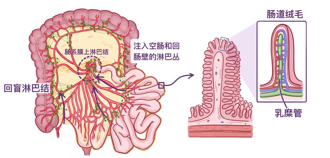 空肠和回肠的淋巴引流始于肠绒毛中的特殊淋巴管,称为乳糜管。这些管道排空淋巴液到空肠和回肠壁上的淋巴丛中,然后排入系膜层中的各种淋巴管和淋巴结。最终,所有这些都收集到肠系膜上淋巴结。此外,回肠的淋巴从末端回肠排入回盲淋巴结。
