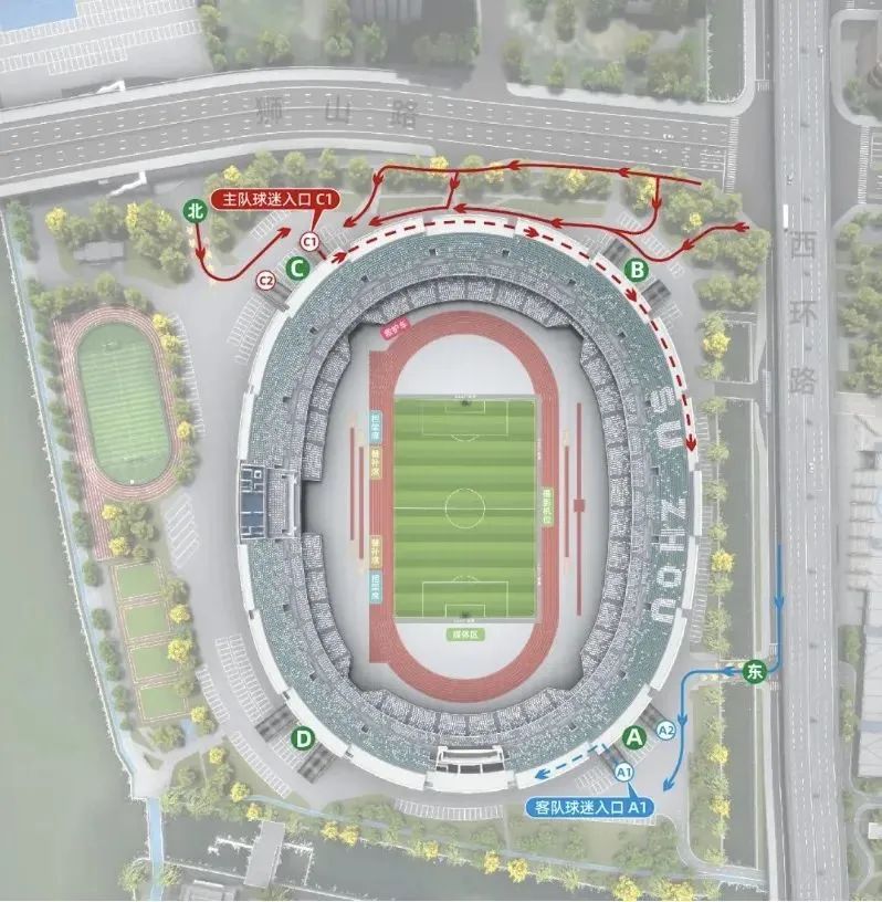 自驾or打车导航定位:苏州体育中心体育场-东北门。赛事前夕苏州体育中心周边道路流量爆发式增长、苏州体育中心内部停车场管控,球迷可绕行至周边其他停车场。比赛场馆附近停车资源分布: