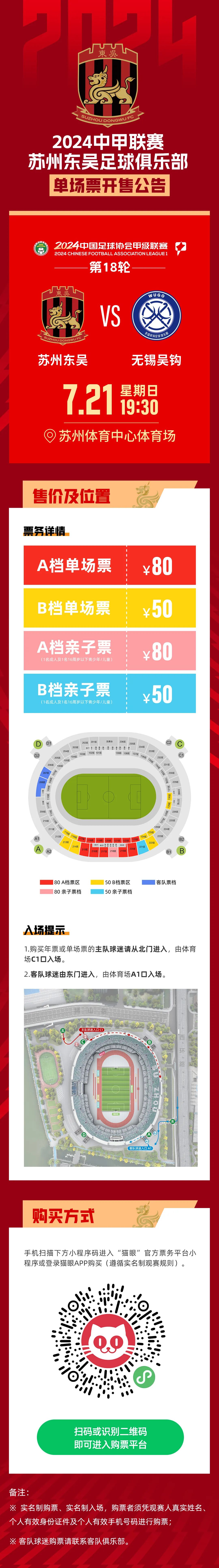 1、为进一步营造主场氛围,敬请广大球迷朋友身着俱乐部队徽配色(红、黑色)球迷服、助威服、文化衫入场。同袍一心,荣耀为苏州!
