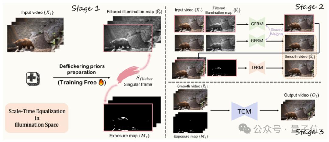 一方面,BlazeBVD使用一个叫做全局闪烁去除模块(GFRM)的工具,利用之前提取的光照图来调整整个视频的光线,确保每一帧的亮度和颜色看起来都很自然。