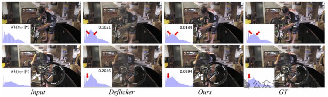 其中Deflicker为已有方法,GT(Ground Truth)表示理想的无闪烁视频,而KL散度表示处理后的视频与理想无闪烁视频之间的差异。KL数值越大,差异越大。可以看出,BlazeBVD能很好地恢复照明直方图,同时避免出现颜色伪影和颜色失真(例如第二列男人的手臂)。