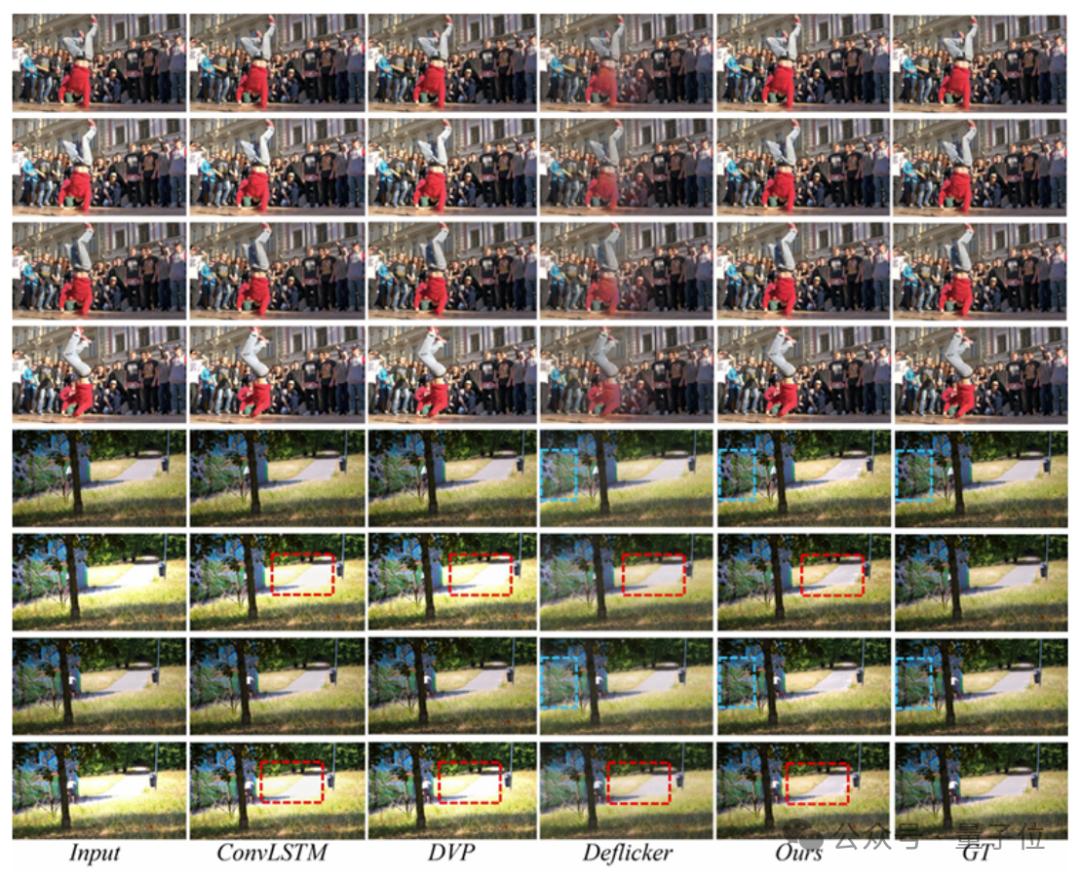 直接看已有方法与BlazeBVD在盲视频去闪烁任务上的结果对比: