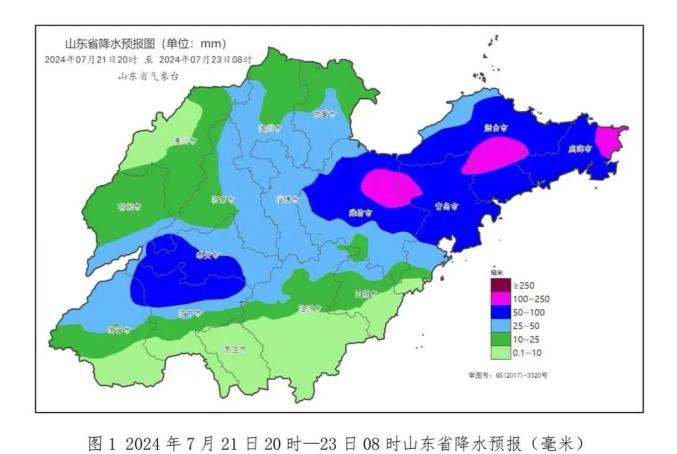 全省过程累积平均降水量30~50毫米,其中,潍坊、青岛、烟台和威海有大到暴雨部分地区大暴雨(50~80毫米,局部100~200毫米),聊城、滨州、东营、济南、泰安、淄博、菏泽北部、济宁北部和临沂北部有中到大雨局部暴雨(20~40毫米,局部50~100毫米),其他地区有雷雨或阵雨(3~10毫米,局部25毫米以上)。