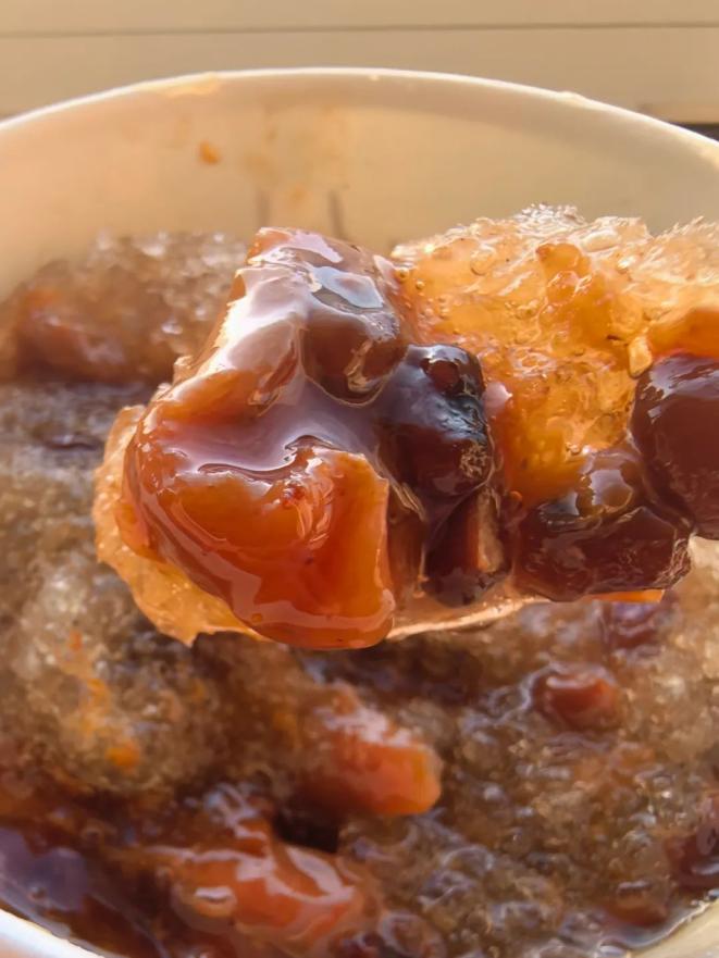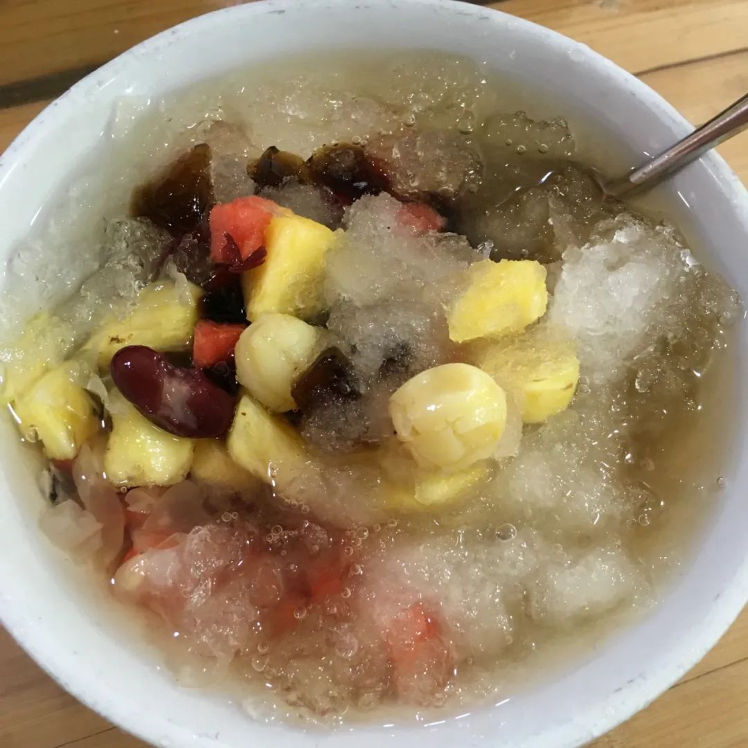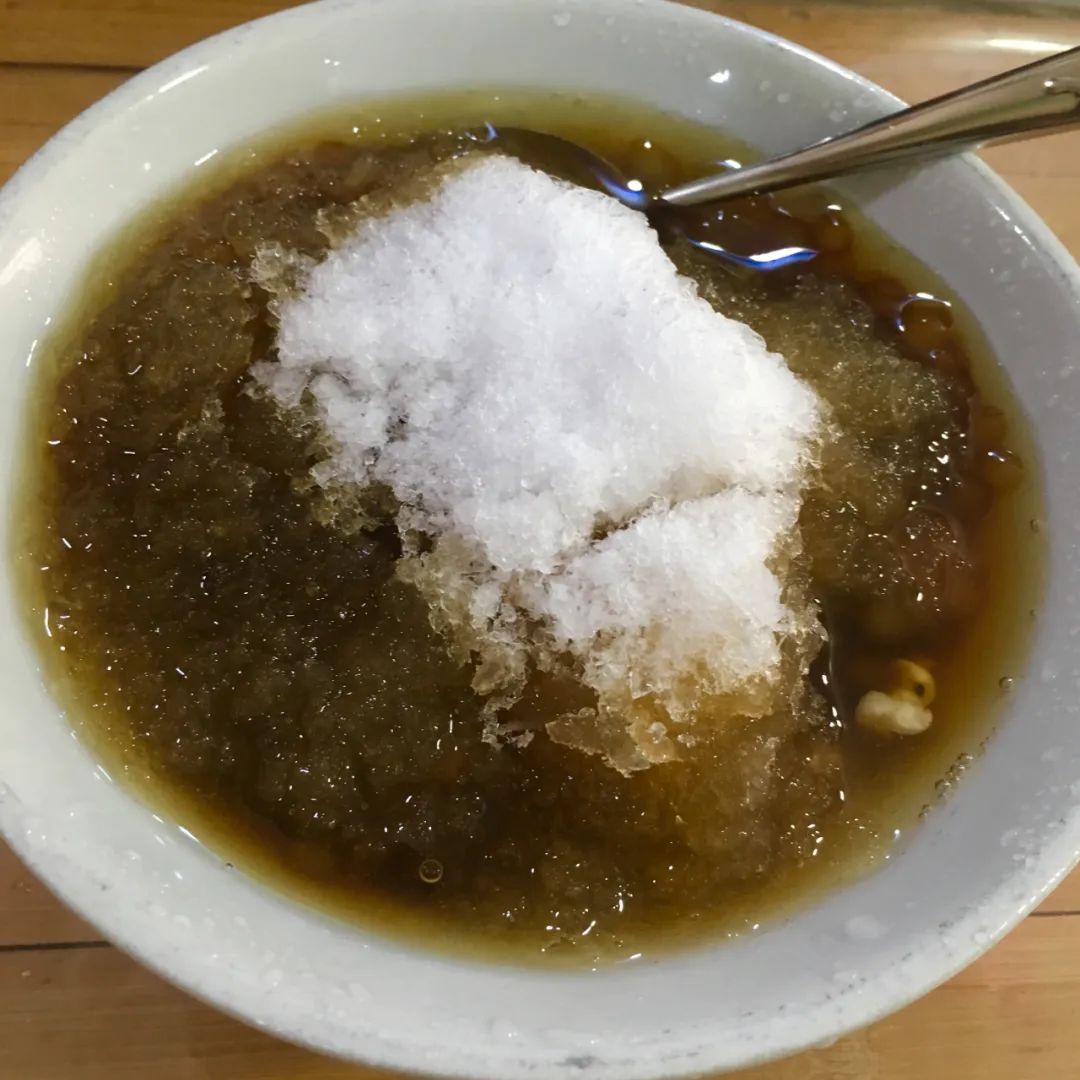 刚开始吃的时候冰还比较完整有点拌不开,等冰渐渐融化,一边感受红糖水的清凉,一边捞里面的配料吃,混合着碎冰透心凉,很适合配火锅,解辣一流。