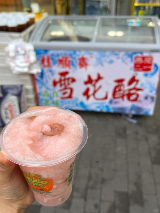 天津人还有自己的星冰乐——雪花酪,6元一杯,不仅是夏季限定美味,也是天津小孩的童年。雪花酪比刨冰量小,口感更细腻,一般用葡萄干、红果片、杏干、话梅、蜂蜜、桂花熬水,再把水冻起来做成冰沙,看起来粉橙粉橙的。