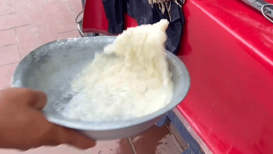 用纱布裹住假酸浆籽,在清水中不断搓揉,再加入调配好的清石灰水搅拌混合,静置1~3小时后,便能得到晶莹剔透的胶状物质,便是云南人惯称的木瓜凉粉——其实和四川冰粉很像。